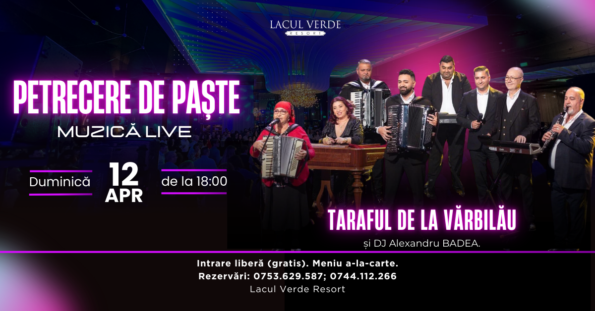 Pregătește-te pentru o seară cu muzică lăutărească, piese autentice și energie 100% românească, voie bună si chef de dans! O atmosferă care adună petrecăreții împreună într-o seară perfectă pentru sărbători pascale de neuitat, în regatul naturii, la Lacul Verde Resort.